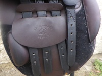Zánovní pony sedlo argentinské značky, posedlí 16, komora široká do obráceného U, užší přes lopatky, vlněný polštář, nastavitelné opěrky, na rovný hřbet